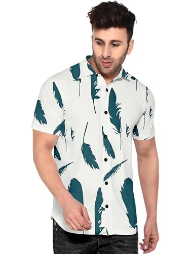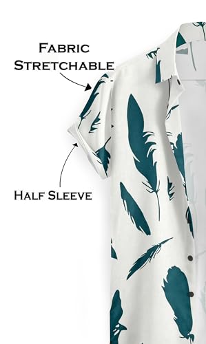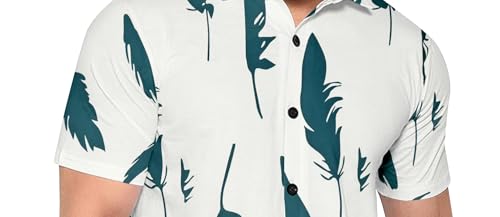 Restyle Men's Casual Button Down Shirt, White with Teal Feather Print, Cotton Blend, Short Sleeve, Regular Fit, Beach Theme Summer Wear