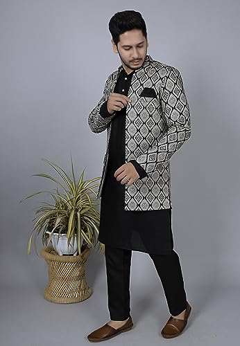 Amzira Men's Jacquard Casual Regular Printed Full Sleeve Knee Length Kurta Pyjama With Long Koti Jacket/Waistcoat 3 Piece Ethnic Wear Set