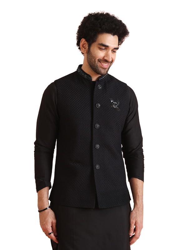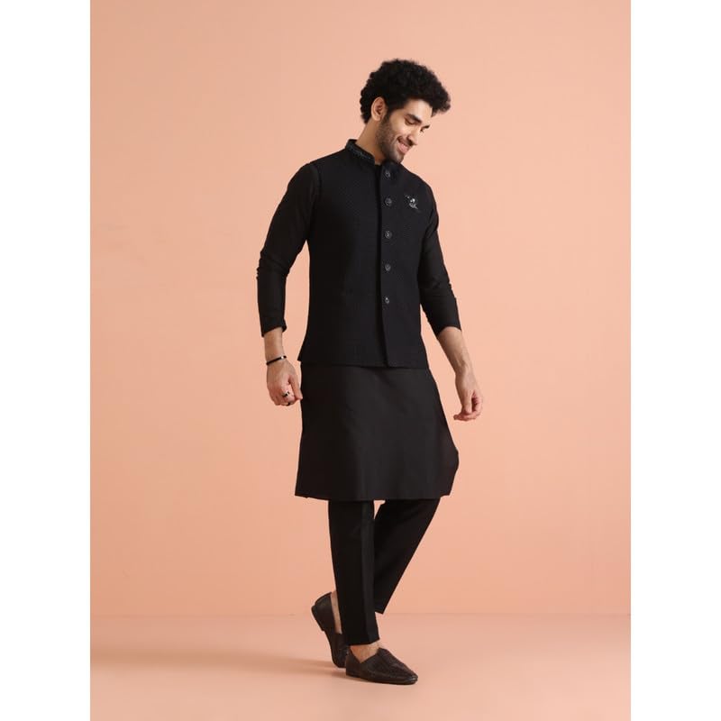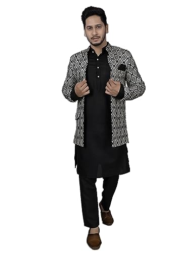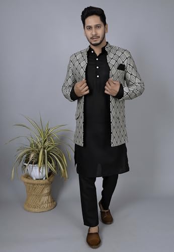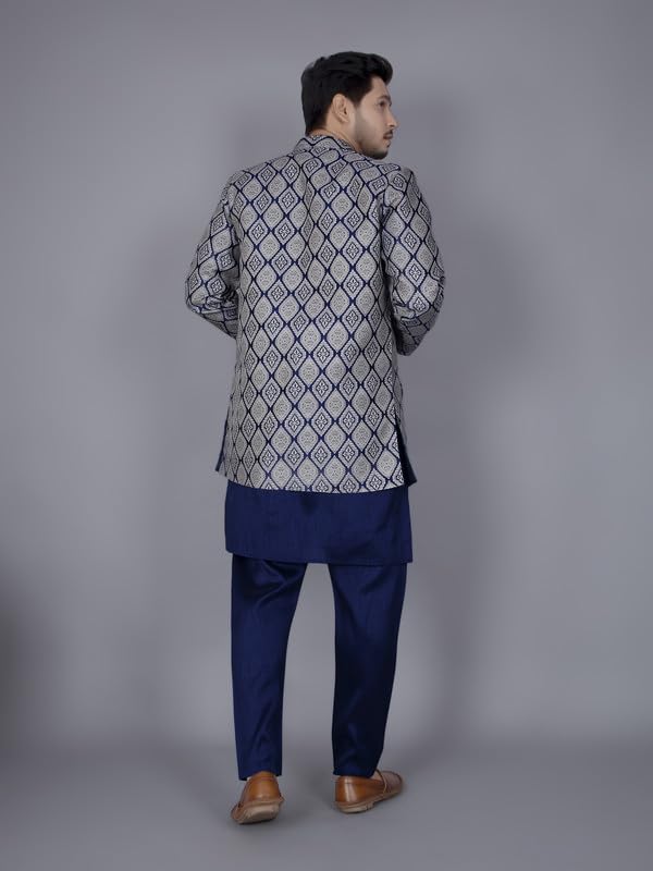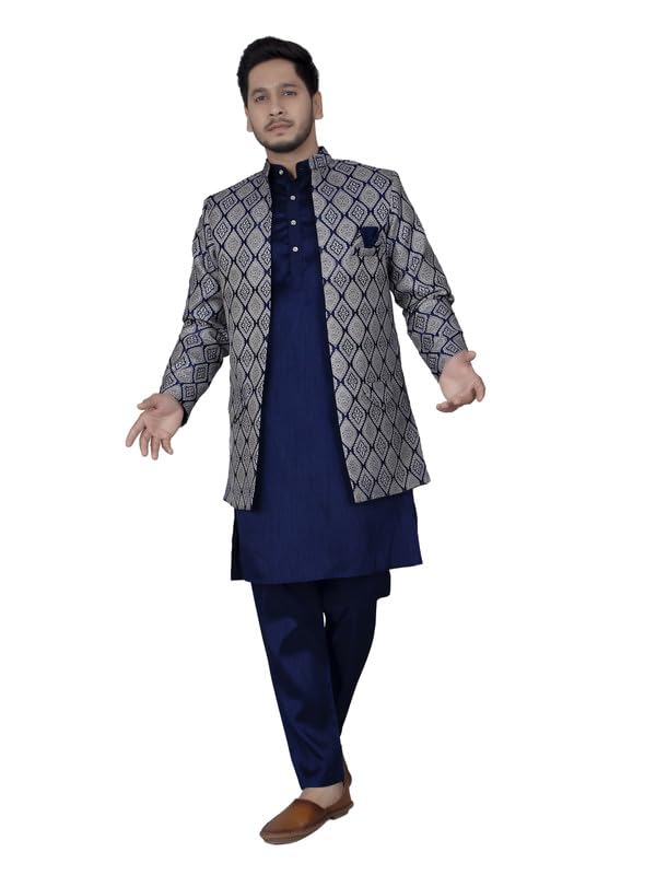 Amzira Men's Jacquard Casual Regular Printed Full Sleeve Knee Length Kurta Pyjama With Long Koti Jacket/Waistcoat 3 Piece Ethnic Wear Set